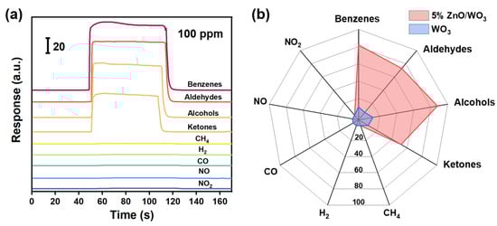 (a) Typical response curves of the 5% ZnO/WO3 sensor towards representative VOC targets (typically benzenes, aldehydes, alcohols, and ketones) and conventional flammable or toxic gases (methane, hydrogen, carbon oxide, nitric oxide, and nitric dioxide) with a concentration of 100 ppm at 300 °C. (b) Comparison of sensitivities of the WO3 and 5% ZnO/WO3 sensors to evaluate their sensing selectivity properties.