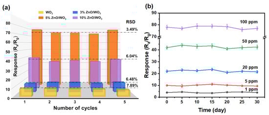 Sensing stability is one of the key criteria to evaluate whether the gas sensor can be used for practical applications. A good stability requires that the sensor can repeatedly respond to the target gas of a specific concentration without significant response decreases. Hence, the response reproducibility of the four sensors to repeated exposure of toluene vapor were experimentally explored. Figure 9a demonstrates typical sensing responses for five repeatable circles to 100 ppm toluene vapor at the operating temperature of 300 °C. It depicts that although the RSD (relative standard deviation) values of the corresponding responses were all less than 10%, the 5% ZnO/WO3 sensor showed the best signal reproducibility (RSD = 3.49%) among the four sensors, which is of great significance for reliable quantitative gas monitoring. Furthermore, the long-term stability of the 5% ZnO/WO3 sensor to toluene with different concentrations was also measured, as demonstrated in Figure 9b. It reveals that the sensor exhibited nearly constant responses (RSD < 2%) to 1, 5, 20, 50, and 100 ppm toluene with a long period of intermittent tests, confirming a perfect stability of the as-developed ZnO/WO3 sensors for VOC detection.