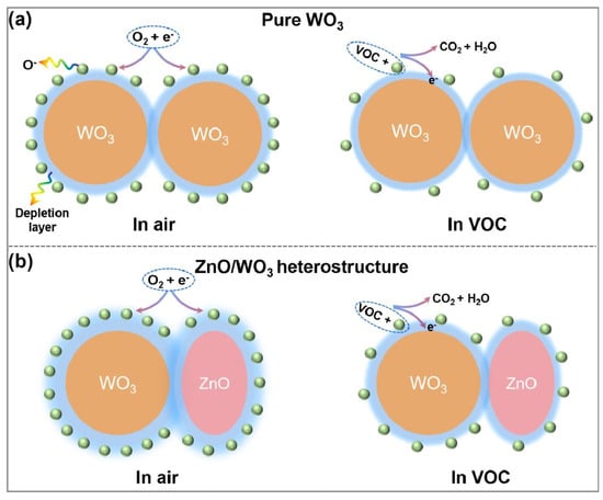 Schematic gas sensing diagram of (a) pure WO3− and (b) ZnO/WO3 nanocomposite-based sensors exposed to air and VOC, respectively. The space-charge layer model is used to explain the sensing mechanism.