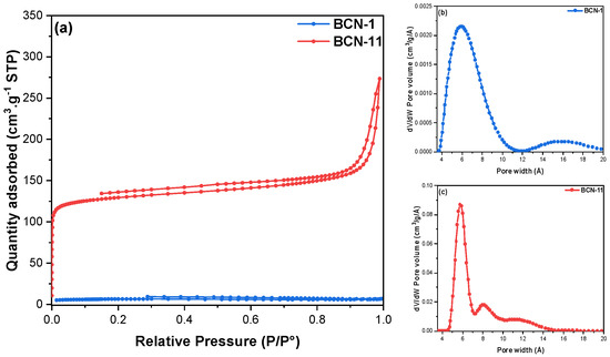 (a) Nitrogen adsorption–desorption isotherms at −196 °C of BCN−1 and BCN−11; (b,c) Pore size distribution of BCN−1 and BCN−11 by NLDFT method.
