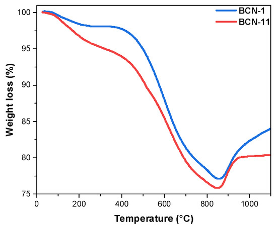 According to TGA (Figure 3), BCN-1 and BCN-11 gradually lose mass upon increasing the temperature until 850 °C, owing to their decomposition related to carbon oxidation [21,41] as well as the partial oxidation of nitrogen resulting in the release of nitrogen oxide [42]. On the other hand, the mass increase after 860 °C is related to the oxidation of the unstable boron moieties forming boron oxide [21,43]. As a note of comparison, it has been proven that pure carbon materials, e.g., carbon fibers, lose their total mass at 740 °C while losing only 20% at the same conditions after BN doping [44]. This demonstrates that the BCN materials present higher stability under air than carbon materials.