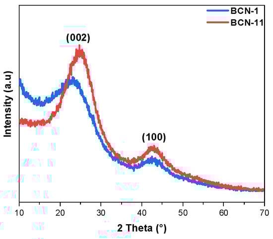 X-ray diffraction patterns of BCN-1 and BCN-11 (Figure 4) show two broad diffraction peaks. The first one is centered at around 24° and the second at around 43°. These peaks positions are characteristics of both hexagonal BCN and hexagonal BN despite the limited crystallinity of the samples. The two peaks correspond to (002) and (100) reflection planes, respectively. In comparison with h-BN, the BCN samples show a general broadening of diffraction planes as well as a shift in the (002) plane towards lower 2θ values (centered at 26.3° for BCN-1 and 24.9° for BCN-11) indicating that the doping of carbon produces structural defects and an increase in interlayer spacing [24,45,46]. The 100 diffraction peaks of all synthesized BCN remain unchanged and are centered at 42.4°. Similarly to BN and BCN materials, graphite shows a diffraction peak at around 26° corresponding to the (002) reflection plane (which is rather sharp). However, it also presents a second peak around 55° assigned to the (004) reflection plane [47]. This implies that C atoms form hybrid BCN domains instead of aggregating to graphite domains.