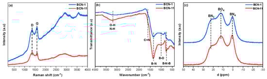 The FTIR spectra (Figure 5b) obtained from BCN-1 and BCN-11 show two bands centered at around 1367 cm−1 and 780 cm−1 that correspond to the in-plane stretching vibration of B–N and to the B–N–B bending vibration, respectively. In addition, the broad band at around 3240 cm−1 can be attributed to the O–H and/or N–H bonds. Finally, the two small peaks detected at around 1593 cm−1 and 1008 cm−1 could be attributed to C=N and B–O, respectively [52,53]. On the other hand, C–N and B–C bands, usually located between 1100 cm−1 and 1300 cm−1 have not been detected, probably due to overlap with the B–N band [24,52,54,55]. Solid-state 11B MAS NMR spectroscopy was undertaken to study the chemical environment of the B atoms. The spectra in Figure 5c show three distinct signals. In order to identify these signals, we have referred to several studies found in the literature (Table S2). Accordingly, the first signal at around 22 ppm is assigned to the B–N bond related to planar BN3 groups. The peak at around 12 ppm can be attributed to BO3 groups. As for the peak at around 0 ppm, several suggestions have been reported. It is often assigned to tetragonal BN4 groups but can also be attributed either to the B–C structure or to tetragonal BO4. In our case, as the B–C bond could not be detected in FTIR analyses, it is reasonable to attribute it to tetragonal BN4 groups.