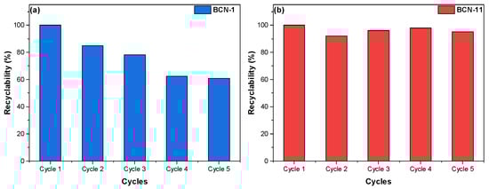 Figure 8 shows the CO2 uptake of BCN-1 and BCN-11 after five adsorption–desorption cycles. As one can see, BCN-11 shows a good recyclability with a recycling percentage of 96%. However, the uptake of BCN-1 decreased to 60% at the 5th cycle. These results are in good agreement with the aforementioned isosteric enthalpy values. The ease of recyclability with BCN-11 is related to the dominant physical nature of adsorbent–adsorbate interactions. With respect to BCN-1, it presents possible chemical interactions with CO2, probably due to its slightly higher N content, which may explain why its recyclability is partially compromised. It is known that, in addition to microporosity, a higher density of N groups helps increase the isosteric heat of adsorption [58,59].