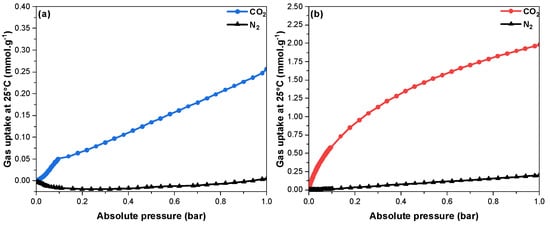 In order to capture CO2, from either air or flue gas, the selectivity for CO2 adsorption as opposed to N2 represents a key factor for these targeted applications. Figure 9 shows the adsorption isotherms of both N2 and CO2 at 25 °C. One can see that the amount of CO2 adsorbed was much higher than that of N2 in any pressure range. This was further confirmed by the calculation of the selectivity value based on the IAST method for flue gas composition evaluated to be equal to 26 for BCN-11. However, since the N2 adsorption for BCN-1 at 25 °C is too low, it leads the selectivity equation to diverge to infinity based on a null value of q2, which is considered insignificant. This falls under the category of the theory’s limitations, when working at low pressure [60].
