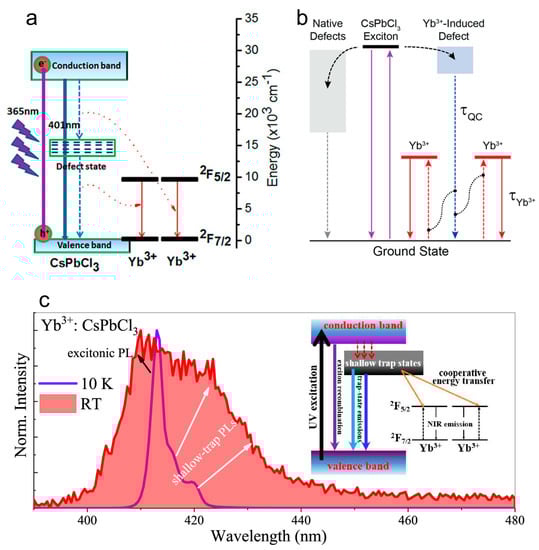 - Li, X.; Duan, S.; Liu, H.; Chen, G.; Luo, Y.; Ågren, h. Mechanism for the Extremely Efficient Sensitization of Yb3+Luminescence in CsPbCl3 Nanocrystals. J. Phys. Chem. Lett. 2019, 10, 487–492. [Google Scholar] [CrossRef] [PubMed]