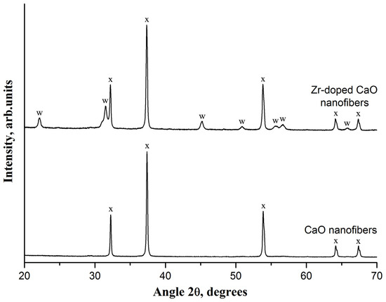 The XRD patterns of the pure CaO nanofiber sorbent and Zr-doped CaO nanofiber sorbent. The following compounds were identified: (x)—CaO; (w)—CaZrO3.