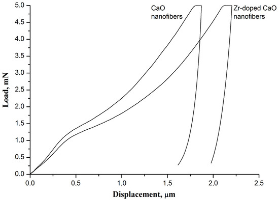 The load–displacement curves of the virgin pure CaO nanofiber sorbent and the virgin Zr-doped CaO nanofiber sorbent.