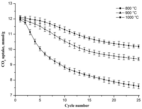 As mentioned above, CaCO3 sintering occurs not only during the carbonation stage but also when the resulting CaCO3 is heated to the decarbonation stage and during the decarbonation stage, where sintering occurs more intensively at a higher temperature, which is confirmed by the results presented in Figure 5. It can be seen that the decrease in the CO2 uptake capacity is more notable with each increasing cycle number at a higher decarbonation temperature. In the 25th cycle, the CO2 uptake capacity reaches 10.2, 9.4, and 7.6 mmol/g if decarbonation occurs at 800, 900, and 1000 °C, respectively. The drop in the capacity value increases from 1.9 to 4.3 mmol/g as the decarbonation temperature increases from 800 to 1000 °C. An increase in the decarbonation temperature to 800, 900, and 1000 °C also leads to a decrease in the specific surface area of the sorbent after 25 carbonation/decarbonation cycles, and the specific surface area of the sorbent decreases to 67, 61, and 50 m2/g, respectively, which indicates that the rise in the decarbonation temperature stimulates the growth of CaO grains.