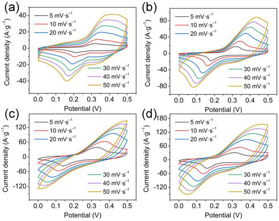 After determining the successful preparation and obtaining the pore size information of the CoOx nanowires, the electrodes are applied to SCs as cathodes in a 2 M KOH electrolyte. In Figure 3a−d, different from the rectangular CV curves of capacitive materials, all CoOx electrodes exhibit obvious symmetry redox peaks at various scan rates, belonging to the typical electrochemical features of battery-like materials. The possible redox reactions have been reported in the recent literature [20,38,39].