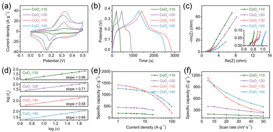 Electrochemical properties of the CoOx electrodes: (a) the CV curves at 5 mV s−1, (b) the GCD curves at 1 A g−1, (c) Nyquist plots, (d) the linear plots of log (Ip) versus log (ν), (e) specific capacities at various current densities, and (f) specific capacities at various scan rates.