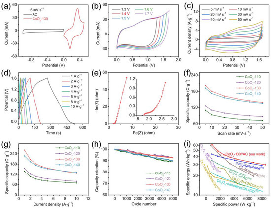(a) The window match of CoOx-130 (red) and AC (black); (b) CV curves at various potential windows at 50 mV s−1; (c) CV curves at various scan rates, (d) GCD curves at various current densities, and (e) Nyquist plot of the CoOx-130//AC HSC; (f) specific capacities at different scan rates, (g) specific capacities at different current densities, and (h) cycling performance of the CoOx//AC HSCs; (i) Ragone plots for the CoOx-130//AC HSC.