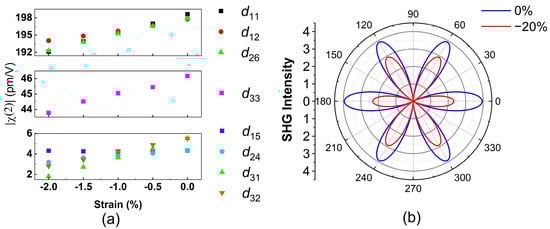 is the calculated SHG susceptibility without strain. The coefficients and were obtained by generating linear fits of the calculated strain dependence on the SHG susceptibilities shown in Figure S8a,b in the Supplementary Material. The blue line and the red line in Figure 4b reveal the calculated angle-resolved for and in Equation (6), respectively. Here, a large strain value of −20% was intentionally used to highlight the variation in the angle-resolved SHG pattern. Compared with the pattern without strain, the overall intensity reduces, but it exhibits anisotropy due to the strain. The rotational symmetry is reduced from six-fold to two-fold symmetry because the uniaxial compressive strain along the AC direction lowers the crystal symmetry of γ-InSe from the point group of to the point group of . The two petals at and , which mean that the laser polarization is along the uniaxial strain direction, reduce more than the other four petals do. In Equation (6), the term, which is a function with six-fold rotational symmetry, describes the angle-resolved without strain, as shown by the blue line in Figure 4b. The modification due to the strain effect is found in the term , which is a function with two-fold rotational symmetry. Therefore, the modification due to the strain term reduces the symmetry of the angle-resolved , as shown by the red line in Figure 4b.