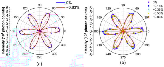 Figure 1 reveals the scanning optical images of unstrained InSe flakes. To confirm that the PMT signals in Figure 1 were SHG signals from the InSe flakes, we measured the spectrum of the collected light in front of the PMT, as shown in Figure S6a in the Supplementary Material. The Gaussian-like feature centered at 394 nm confirmed the SHG of the incident light pulse centered at ~790 nm. We also conducted power-dependent measurements to confirm the SHG process, as shown in Figure S6b in the Supplementary Material. The fitting line with a slope of ~2 in the log–log scale confirmed the quadratic dependence of SHG intensity on the fundamental laser power. For the SHG images in Figure 1, the polarizers were set so that the polarization of the detected SHG was parallel to the polarization of the incident light. While the samples were rotated from −20 to 30 degrees, the optical intensity of the biggest flakes among the three flakes increased to a maximum at 0 degree, shown in Figure 1c, and decreased to a minimum at 30 degrees, shown in Figure 1f. To further quantitatively analyze the angle-resolved SHG intensity, we summed up the signals over the biggest flakes in the images of different rotational angles. The angular dependence on the SHG intensity of parallel polarization (denoted as ) from the biggest InSe flake is revealed by the blue squares in Figure 2. Because the hexagonal -InSe exhibits the point group of , the angle-resolved under normal incidence also reveals six-fold rotational symmetry. The maximum intensity occurs at the angle of the incident light polarization along the AC direction [41]. The angle-resolved was fitted with , as shown by the blue line in Figure 2. Here, is defined as the angle of AC direction with respect to the linear polarization of the incident laser beam. Angle-resolved analysis is capable of determining the crystal orientations of different flakes on the substrate. For example, while the SHG intensity of the upper left flake in Figure 1a was traced for different rotational angles in Figure 1a–f, the maximum SHG intensity occurs at 10 degrees in Figure 1d. In contrast to the maximum SHG intensity of the biggest flake occurring at 0 degree in Figure 1c, the orientation of the upper left flake was rotated by 10 degrees with respect to that of the biggest flake. We also conducted mapping measurements with SHG polarization perpendicular to the polarization of the incident light (denoted as ). For a similar angle-resolved analysis of the biggest flake, the orange points in Figure 2 depict the experimental data in the polar plot of , which manifest a thirty-degree-rotated pattern of , and they are fitted with .