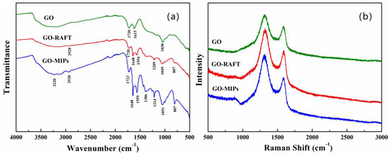 FTIR spectra (a) and Raman spectra (b) of GO, GO-RAFT, and GO-MIPs.