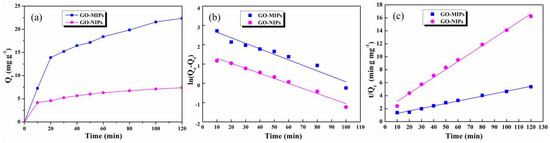 Dynamic adsorption (a), pseudo-first-order kinetic for adsorption (b), and pseudo-second-order kinetic for adsorption (c) of GO-MIPs and GO-NIPs.