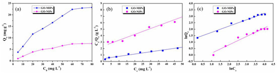 Adsorption isotherms (a), Langmuir (b), and Freundlich (c) isotherm models of GO-MIPs and GO-NIPs.