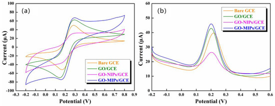 The modified electrodes were prepared by simply dropping the obtained GO-MIP nanocomposite dispersion on a freshly polished glass carbon electrode (GCE) and then drying it. The surface status and the barrier of the different modified electrodes could have been monitored by the CV using potassium ferrocyanide as a probe [42]. Figure 7a shows the CV responses of four different modified electrodes in a 5.0 mM K3[Fe(CN)6] solution and 0.1 M KCl. In the case of the bare GCE, the typical reversible process of the electrochemical response for [Fe(CN)6]3− was observed. With the unique electric conductivity, the redox peak current was shown to increase for GO/GCE compared with bare GCE. As for GO-MIPs/GCE, the electrochemical behavior was equal to or slightly superior to GO/GCE, which could be explained by the possibility that the [Fe(CN)6]3− molecules could easily reach the surface of the electrode through the vacant cavities. In contrast, the redox peak current of [Fe(CN)6]3− declined dramatically after GCE was coated with GO-NIPs, which could be due to the weak conductivity of dense polymers. The successful fabrication of the GO-MIPs sensor was further verified by DPV, and the results were in good agreement with the CV results. As shown in Figure 7b, the distinct redox peak of [Fe(CN)6]3− was found to be at around 0.2 V, and the peak current of GO-NIPs/GCE was significantly lower than those of bare GCE, GO/GCE, and GO-MIPs/GCE, providing direct evidence of vacant cavities in the GO-MIPs.