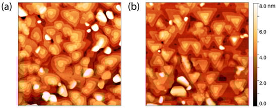 To test the applicability and efficiency of our procedure on other substrates, we repeated the annealing procedures on 5 nm BST films on a SrTiO3 (111) substrate. The films were deposited using the same growth conditions. The lattice mismatch between BST and SrTiO3 is larger than for BST and Al2O3, with values of −21.7% and −9.2%, respectively. As a result of this large lattice mismatch, the BST films on SrTiO3 generally exhibit a mosaic twist [16], which is reflected in the surface morphology presented in Figure 6a. Additionally, the multi-directional triangular islands reveal that both twin domains are present. Without a post anneal, the BST film shows a large coverage of the substrate surface compared with the film deposited on Al2O3 substrates.