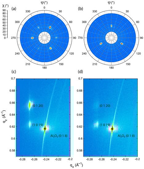 Pole figures taken in symmetric 2θ−ω configuration at 2θ = 38.06°, mapping the BST {1010} for two 10 nm BST films deposited on Al2O3 substrates with a terrace width of approximately (a) 270 nm versus (b) 60 nm. ϕ and χ represent the azimuthal and tilt angles, respectively. Their corresponding RSMs are presented in (c,d), respectively. The inversion observed in the intensities of the BST reflections in the RSM can be attributed to crystal twinning.