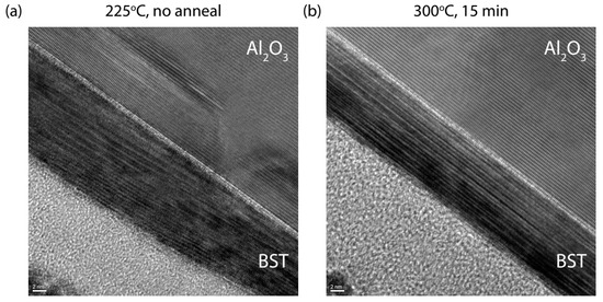 Post-anneal-induced structural improvement in the films visualized by TEM analysis. TEM images presenting a cross-sectional view along the [2-1-10] direction of a 10 nm BST film deposited at 225 °C (a) and a 10 nm BST film deposited at the same temperature but post annealed at 300 °C for 15 min (b).