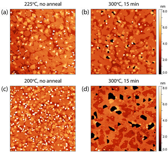 For our study, to improve the structural quality and surface morphology of ultra-thin BST films, we employed annealing temperatures of 250 °C, 275 °C, 300 °C, and 325 °C, see Figure 3. All films were deposited at 225 °C. During the post anneal and the cool down from the post-annealing temperature to the deposition temperature, we maintained a Te-rich atmosphere to prevent the out-diffusion of Te [35]. To gain insight into the influence of the annealing temperature on the deposited films, we also deposited BST films at these elevated temperatures. At a growth temperature of 275 °C, we were still able to grow a crystalline BST film. However, raising the growth temperature to 300 °C resulted in no material being adsorbed on the substrate. From the AFM results presented in Figure 3, we conclude that the films still contain buckled crystals when annealing temperatures below this limit, i.e., 250 °C and 275 °C, were empolyed.