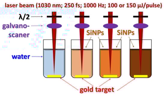 To improve the functionality of plasmonic nanoparticles, we employed the PLAL technique by irradiation of a gold target (purity of 99.999%) in deionized water-based environment with 30 nm spherical Si NPs whose concentration was varied in the range of 0–70 mg/L (Figure 1) []. Bare Au NPs were obtained by PLAL without Si NPs while the presence of Si NPs in water led to the formation of hybrid nanostructures. A femtosecond laser (PHAROS from Light Conversion, 250 fs pulse duration, 1030 nm wavelength, 1 kHz repetition rate) with the fluence controlled by a half-wave plate (100 and 150 µJ/pulse) was used. The position of the laser beam focused on the sample surface into a 50 µm diameter spot was controlled by a galvanoscanner with 2 m/s scanning speed within the irradiation area of 10 × 10 mm2. The gold samples placed under 10 mm water level were irradiated for 20 min. Large NPs, which were found to be formed in a small amount, were removed by a size separation step using the centrifugation at 10,000× g for 10 min [].