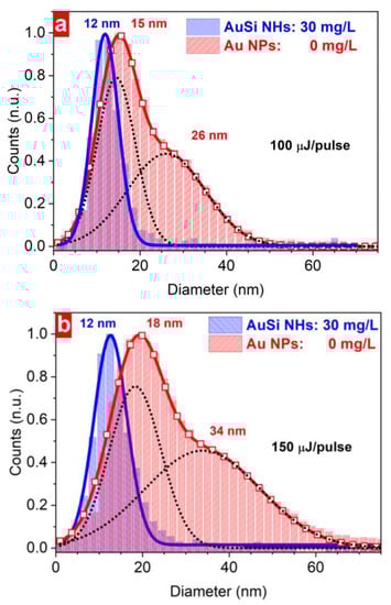 The size distributions of nanoparticles synthesized in pure water and in water with suspended Si NPs (30 mg/L) at two different laser pulse energies are presented in Figure 3. Bare Au NPs exhibit bimodal size distributions with the mean sizes in the first and second peaks, respectively, of ~15 nm and ~26 nm at 100 µJ/pulse, and ~18 nm and ~34 nm at 150 µJ/pulse. Their full width at half maximum (FWHM) showed broadening > 30% when the irradiation energy was increased by 50%: ~10.5 nm and ~21 nm at 100 µJ/pulse; ~14 nm and ~31 nm at 150 µJ/pulse. The presence of two peaks in the size distributions may indicate that different mechanisms of nanoparticle formation upon laser ablation in the case of bare Au NPs (see [] and Section 4). It can be speculated that, by adding Si NPs in the reactive solution, some mechanisms are suppressed. Indeed, hybrid AuSi NPs exhibit only one peak in the size distribution, which is narrower as compared to bare Au NPs. In particular, the FWHM decreased from ~10.5 nm for bare Au NPs to ~8 nm for NHs at 100 µJ/pulse and from ~14 nm to ~9 nm, respectively, at 150 µJ/pulse. Interestingly, the FWHM is found to be almost fluence-independent for hybrid nanostructures. Moreover, the same mean size (~12 nm) of AuSi NHs was observed for nanomaterials synthesized using two different laser fluences. These findings indicate a strong sensitivity of the photochemical reactions occurring during formation of Au-based NPs to their molecular environment.