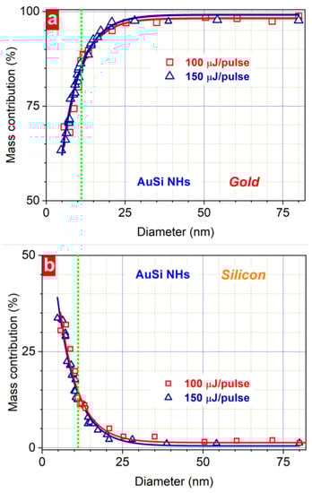 Size-dependent gold (a) and silicon (b) mass content in AuSi NHs prepared at 100 µJ/pulse and 150 µJ/pulse laser fluence. The green dotted lines correspond to the size of AuSi NHs containing equal number of Au and Si atoms.