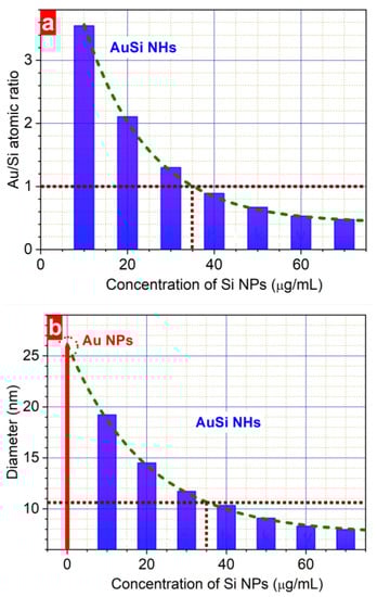 To explore the influence of reactive medium, the dependences of both the chemical composition and the mean size of the hybrid NPs on the concentration of Si NP in water were analysed (Figure 5). It has been found that they were identical at different laser fluences. Moreover, with increasing the concentration of the Si NPs, the ratio of numbers of gold and silicon atoms (Au/Si ratio) reduces exponentially from 3.5 (10 μg/mL) to 0.5 (70 μg/mL) (Figure 5a). At the same time, the mean size of laser-synthesized NPs decreases from 19 nm at 10 μg/mL to 8 nm at 70 μg/mL (Figure 5b). The equal amount of gold and silicon atoms was achieved in 11 nm AuSi NHs formed at 35 μg/mL Si NP concentration in water. These observations allow us choosing an appropriate concentration of Si NPs in order to synthesize AuSi NHs of a given size or with a certain ratio between atoms.