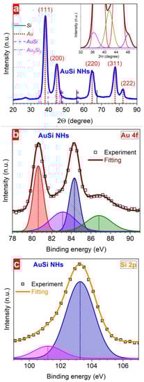 To study the structure and the phase composition of AuSi NHs, XRD, and XPS analyses were employed. Several clear maxima were found in the XRD patterns at different 2Θ values reflecting the crystalline structure of formed nanohybrids (Figure 6a). The most pronounced peaks were observed at 38.4°, 44.8°, 64.8°, 77.5°, and 82.3° and also some responses are seen at 36.3°, 41.7°, and 47.9° pointing to a polycrystalline nature of the nanostructures. The presence of different phases of nanostructured elements in the hybrid nanoparticles was analysed using XPS. Analysing the Au 4f spectrum, it was concluded that there is a possibility of several charge states of gold in the hybrid NPs. In order to identify them, the spectrum was deconvoluted by assuming the presence of two doublets with different full widths at half maximum (1.21 eV and 3.00 eV). Afterwards, each doublet was fitted by two Gaussian curves resulting in four signals with the following binding energy values: 80.1 eV and 84.3 eV (the first doublet) as well as 83.1 eV and 86.8 eV (the second doublet) (Figure 6b). The ratio between their integral intensities allows estimating the contribution of each charge state: 1.0:0.8:0.7:0.6.