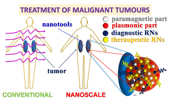 Based on the results summarized above, we propose the following structure of gold–silicon nanohybrids prepared by laser ablation. The synthesized composite gold–silicon nanoparticles represent combinations of different nanodomains such as metallic gold of various crystallinity responsible for plasmonic properties, gold silicide of different stoichiometry as well as SiO and SiO2 reflecting paramagnetic features of the nanohybrids. Our results indicate that the developed method extends the functionality of plasmonic metal nanostructures by laser-induced combination with semiconductor materials, thus allowing their non-invasive tracking by magnetic resonance imaging techniques. As an outlook, we assume that it can provide further significant extensions of the performance of hybrid metallic-semiconductor nanoparticles by the development of multifunctional nanotools due to their combination with other elements. For instance, laser-induced incorporation of different types of radionuclides (RNs) can add new modalities to laser-synthesized nanostructures such as diagnostic and/or therapeutic one by choosing an appropriate type of elements (Figure 8). It can considerably facilitate the formation of radionuclide nanocarriers for nuclear nanomedicine that are currently performed by complexed chemical methods [,] where RNs can play a dual role (both diagnostics and therapeutic), locally detecting or treating a malignant tumour. Together with surfactant-free synthesis allowing chemical composition variation, such ultrapure multicomponent nanoagents can play a very important role in many biomedical applications such as bioimaging, biosensing, hyperthermia, nuclear medicine, photodynamic, and radio-therapy of cancer (Figure 8) [,].