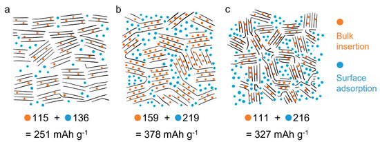 An important work published by Wu et al. [53], studied the effect of lignin molecular weight on lignin-carbon anodes on K+ storage mechanisms. The authors stated that the K+ storage in lignin anodes was highly dependent on the bulk-insertion and surface-adsorption sites, which in turn are influenced by pyrolysis conditions as well as the characteristics of lignin precursors (molecular weight). The K+ storage took place in the lattice interlayer spaces of the biocarbon anode structure. Further understanding the mechanism, the adsorption of K+ on the biochar surface was maximized on the disordered carbon areas of the lignin-based anodes. The authors stated that under pyrolysis treatment, the lignin precursor with low molecular weight generated biochars with graphite-like structures due to the easier depolymerization process at high temperatures that increases the degree of graphitization. However, because low molecular weight lignin-based biochars presented less disordered carbon structures, K+ adsorption is reduced which negatively impacts total K-ion storage capacity (Figure 2a). On the other hand, the lignin precursor with high molecular weight yielded biochar anodes with more disordered structures because long lignin chains are more difficult to be depolymerized, fragmented, and aromatized. The biochar anode with more disordered carbon structures increased the adsorption of K+ (Figure 2c). However, when the anodes were prepared from lignin with medium molecular weight, they exhibited a well-balanced combination of disordered and graphite-like structures, which in turn, boosted the K+ storage anode performance by combining surface adsorption and bulk-insertion charge storage mechanisms (Figure 2b).