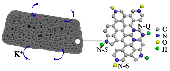 - Sun, Y.; Xiao, H.; Li, H.; He, Y.; Zhang, Y.; Hu, Y.; Ju, Z.; Zhuang, Q.; Cui, Y. Nitrogen/Oxygen Co-Doped Hierarchically Porous Carbon for High-Performance Potassium Storage. Chemistry 2019, 25, 7359–7365. [Google Scholar] [CrossRef]