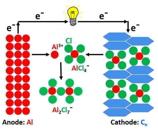 The working principle in ABs is based on intercalation/deintercalation chemistry, where two interfacial reactions take place with AlCl3-IL electrolytes. The two half-cell reactions taking place on the anode and cathode sides are shown in Equations (1) and (2), respectively. Firstly, on the anode side, electrochemical deposition and dissolution processes occur between Al metal and electrolyte take place as described in Equation (1); secondly, at the cathode (graphite or graphene, Cn) side, where intercalation/deintercalation processes of AlCl4− anions take place during the charge/discharge process as described in Equation (2) [64,65,66]. The operating principle of a typical AB is shown in Figure 6. The complex two interfacial reaction chemistry of ABs categorizes them into dual-ion (anion) batteries (DIBs) and not Al-ion batteries (AIBs) similar to LIBs. However, due to the reversible electroplating process of Al metal at the anode, it is possible to employ IL electrolytes, generally composed of a eutectic mixture of AlCl3 and an organic chloride salt from the alkyl-imidazolium halogenides such as 1-ethyl-3-methylimidazolium chloride ([EMIM]Cl). However, finding a suitable electrolyte-cathode pair for AB remains one of the biggest challenges to overcome. But in this review, the issues involving electrolytes will not be addressed, rather the issues involving the cathode side.