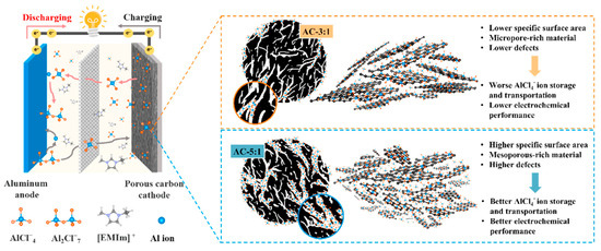 Schematic illustration of AlCl4− ion storage by biomass-derived carbon cathodes in a non-aqueous AIB. Reprinted with permission from [76]. Copyright 2022, Elsevier.