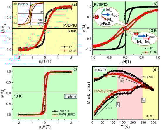 M−H curves are measured for (a) Pt/BPIO at 300 K in IP and OOP directions and (b) Pt/BPIO under low field at 10K in the IP direction. (c) IP M−H curves for Pt/BPIO and Pt/WS2/BPIO at 10 K. (d) M-T curves for both Pt/BPIO and Pt/WS2/BPIO for the IP direction. Inset of (a) has Pt/BPIO measured at 10 and 300 K for IP magnetic field. Inset of (b) indicates the α−Fe2O3 spin flop transition behaviors. Ma (green) and Mb (red) are two sublattices for α−Fe2O3. OOP magnetic field is noted as blue arrow.