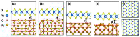 Side view of the simulated Fe3O4 (110)/WS2 heterostructures: (a) B-terminated cubic Fe3O4; (b) AB-terminated cubic Fe3O4; (c) B-terminated monoclinic Fe3O4; (d) A-terminated monoclinic Fe3O4. (e) Top view of WS2 and WS2 (VS-S) with two adjacent S vacancies.