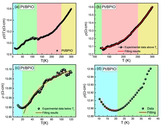 Zero field resistivity measured at temperatures between 10 and 300 K for (a) Pt/BPIO. Curves fitted for temperatures (b) above and (c) below the TV in Pt/BPIO and (d) the minimum resistivity behavior noted below 20 K.
