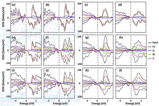 Total and atomically resolved density of states for a standalone Fe3O4 layer: (a) cubic−B, (b) cubic−AB, (c) monoclinic−B, (d) monoclinic−A Fe3O4 layer; and for Fe3O4/WS2 heterostructures: (e) cubic−B/WS2, (f) cubic−AB/WS2, (g) monoclinic−B/WS2, (h) monoclinic−A/WS2, (i) cubic−B/WS2 (VS-S), (j) cubic−AB/WS2 (VS-S), (k) monoclinic−B/WS2 (VS−S), (l) monoclinic−A/WS2 (VS−S). In all cases, the top two atomic layers of Fe3O4 are allowed to relax, while the bottom four layers are kept at their bulk positions (see Section 2).