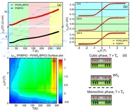 AHE measurements for Pt/BPIO and Pt/WS2/BPIO: (a) temperature−dependent ρxy at 3 T and (b) ρxy at selected temperatures of 10, 100, and 300 K. (c) 2D surface plot of the ρxy difference between Pt/BPIO and Pt/WS2/BPIO. (d) Schematics showing possible differences in MPE between different Fe3O4 phases (cubic and monoclinic) and Pt, as well as the insertion of WS2. Red, black, and yellow arrows indicate Pt, WS2, and BPIO magnetization, respectively.