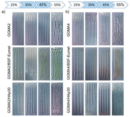 The printability of ink formulations critically depends on their rheological properties, and, hence, their mechanical behavior []. With this aim, GGMA-based ink formulations (GGMA2 and GGMA4-based inks) were screened with a qualitative fusion test to ensure their printability (Figure 3). Results from the filament fusion test showed that GGMA4-based ink formulations were characterized by a better consistency (Figure 3b) when compared to GGMA2-based ones (Figure 3a). Indeed, GGMA4 inks allowed a continuous strut deposition to be obtained, ensuring good printability (Figure 3b). By further increasing the concentration of GGMA, the printability could be seriously compromised, producing brittle and non-printable inks. The presence of BSF-Eumel and HAp improved the printability of the ink, especially at the highest GGMA concentration, as highlighted by a more defined fiber. In terms of infill, results showed that for all the formulations, there was a distinct relationship between the evolution of filament-gap closure and the infill increase. Indeed, filaments deposited with a 55% infill showed a clear overlap. For this reason, 35 and 45% infills were selected as the best parameters for performing further studies (Figure 3) [].