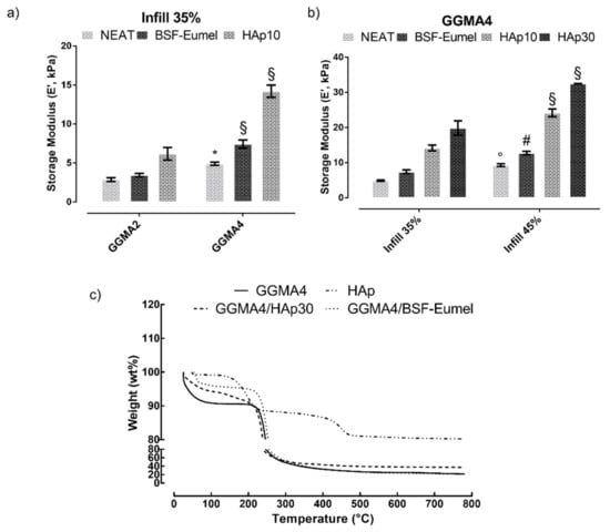 Dynamic mechanical analysis. DMA aimed to assess the effect of the polymer concentration (fixing the infill at 35%, Figure 4a) and the influence of the infill percentage (fixing the polymer concentration, Figure 4b) on the storage modulus (E’) of GGMA-based scaffolds. In addition, the effect of BSF-Eumel and HAp on the storage modulus at different concentrations was also assessed. Mechanical properties were proven to be strongly influenced by the polymer concentration (Figure 4a). In general, GGMA4-based scaffolds showed E’ values higher than GGMA2. BSF-Eumel did not significantly improve the mechanical performances of the GGMA scaffolds. Indeed, E’ ranged between 2.8 and 3.5 kPa, for GGMA2 and between 4.9 and 7.4 kPa for GGMA4. However, by increasing the HAp amount up to 10% (wHAp/wGGMA), E’ values increased from 2.9 to 6.2 kPa (for GGMA2, § p < 0.0001) and from 4.9 to 14.2 kPa (GGMA4, § p < 0.0001) (Figure 4a and b). Similarly, the geometrical constraints also affect the mechanical behavior. Therefore, the effect of the percentage infill on these scaffolds was analyzed (Figure 4b). It was observed that by increasing the infill up to 45%, E’ increased from 4.9 to 9.3 kPa (GGMA4), from 7.4 to 12.7 kPa (GGMA4/BSF-Eumel) and from 14.1 to 24.2 kPa (GGMA4/HAp10). Regarding GGMA4/HAp at 45% infill, by increasing HAp concentration from 10 to 30% (wHAp/wGGMA), E’ showed a significant enhancement from 24.2 to 32.5 kPa (§ p < 0.0001), respectively. In conclusion, scaffolds printed by using GGMA-based inks with the highest polymer concentration (4% (w/v)) and the highest percentage infill (45%) were selected for the following physico-chemical and biological characterization. This choice was based on the compromised results arising from the printability assessment (i.e., filament fusion test) and the mechanical behavior (i.e., DMA test). On one hand, printability with a GGMA concentration higher than 4% (w/v) might be seriously compromised. Furthermore, the fusion test highlighted that over 45% infill, the fibers overlapped, resulting in a 3D non-porous structure. On the other hand, DMA analysis allowed the selection of scaffolds with mechanical behavior suitable for the desired biomedical application [].