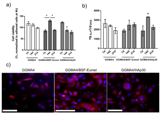Therefore, the study of BSF-Eumel and HAp effect as bioactive signals was extremely interesting for tailoring the GGMA features. GGMA/BSF-Eumel showed the highest cell proliferation compared to the other scaffolds (Figure 6a). Indeed, GGMA4/BSF-Eumel induced an increase in 7F2 osteoblast cell proliferation, achieving a maximum at 14 days (130.2 ± 12.6%, * p < 0.05) (Figure 6a). In contrast, 7F2 cells seeded onto GGMA4/HAp30 reached their maximum proliferation already at 7 days (123.0 ± 6.7%), with GGMA4/HAp30 acting as a booster for cell proliferation stimulus. A subsequent time-dependent decrease in cell proliferation up to 21 days (79.2 ± 14.8%) was observed. Even though 7F2 proliferation on GGMA4/BSF-Eumel and GGMA4/HAp30 was lower than that of GGMA4, their overall cytocompatibility was confirmed (cell viability > 70%) and corroborated by fluorescence microscopy imaging (Figure 6c). After 24 h, osteoblasts exhibited a good proliferation on the bioactivated GGMA scaffolds, without exhibiting significant contact inhibition, with the best behavior achieved by GGMA4/BSF-Eumel (Figure 6c). However, above all, their inherent physiologically triggered activity, as bioactive stimuli capable of supporting cell differentiation, was assessed to explain the reduction observed in the proliferation of osteoblast cells. Alkaline phosphatase is an enzyme involved in the mineralization of bone and an early marker of osteoblast differentiation []. ALP activity was determined from the cell lysates of 7F2 cells grown onto GGMA4-based scaffolds after 7, 14 and 21 days. As shown in Figure 6b, no significant differences in cell differentiation were observed in cells seeded on GGMA4-based scaffolds at different time points. Conversely, BSF-Eumel and HAp gave interesting hints about their cell differentiation-triggering capability. GGMA4/HAp30 exhibited the highest ALP levels at 14 days (# p < 0.001) compared to the other groups, confirming its osteoinduction ability. As shown by Frohbergh et al., 7F2 cells exhibited a negligible ALP activity when grown on a 2D plate, remaining stable over 21 days, and it was consistently lower when compared to cells grown on 3D crosslinked scaffolds, due to a higher surface area []. Since the 7F2 osteoblast cell line represents a late osteoblast phenotype, exhibiting an inherently significant mineralization with respect to other bone-like cell lines, in the presence of an external source of mineralizing bone elements, the cells guide their physiological response toward the differentiation, instead of the proliferation. Meanwhile, GGMA/BSF-Eumel sustained the osteoblast differentiation without any remarkable differences from GGMA/HAp (Figure 6b).