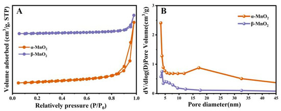 The BET surface areas (SBET), and pore volumes of the two catalysts are shown in Figure 4A,B. It is reported that the different structures assembled by MnO6 octahedra in MnO2 will affect the related surface areas and pore volumes. β-MnO2 presented relatively low specific surface areas (12.76 m2 g−1) and pore volumes (0.06 cm3 g−1), whereas α-MnO2 showed higher specific surface areas (34.59 m2 g−1) and pore volumes (0.13 cm3 g−1). Moreover, the nitrogen adsorption-desorption isotherms of α-MnO2 and β-MnO2 displayed a type IV curve with H3-type hysteresis loops, indicating that both samples were mesoporous structures [33].