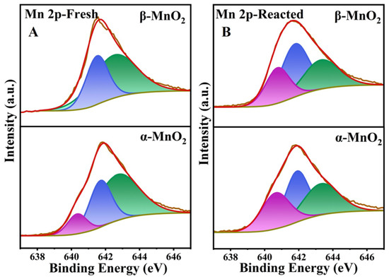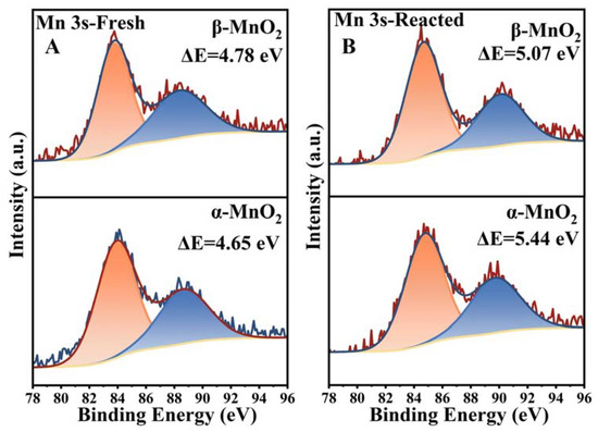 The surface elemental composition and chemical state of these MnO2 samples were identified by XPS. The XPS spectra of Mn 2p3/2 of the samples are shown in Figure 9. The peaks corresponding to binding energies at 642.7, 641.7 and 640.6 eV can be attributed to Mn4+, Mn3+ and Mn2+, respectively [43,44]. It is noteworthy that the binding energy corresponding to different valences of Mn were slightly different in both MnO2 samples, indicating that crystal phase structure has a certain effect on the electron density of the MnO2 surface, which is related to the degree of charge imbalance, oxygen vacancies, as well as the relative content of Mn2+, Mn3+ and Mn4+ [45]. Specifically, the oxygen vacancy will be generated to maintain electrostatic balance with the increasing Mn2+ and Mn3+ proportion, and the proportion of low-valence Mn is generally regarded as an indicator of surface oxygen vacancies [44]. As shown in Table 1 and Figure 9A, the proportion of the low valence Mn (Mn2+ + Mn3+) showed α-MnO2 (41.62%) > β-MnO2 (37.74%). Besides, the average oxidation state (AOS) of MnO2 was calculated according to the formula of AOS = 8.956 − 1.126 ΔE [46], which was based on the size of Mn 3s multiple splitting (ΔE) in Mn 3s XPS spectra (Figure 10A). The AOS values of the Mn element in α-MnO2 and β-MnO2 were calculated to be 3.57 and 3.75, respectively. In previous studies, lower AOS of MnO2 was also able to indicate more surface oxygen vacancies [47]. Therefore, it can be inferred that α-MnO2 has a greater surface oxygen vacancy density than β-MnO2 (in agreement with HETEM and EPR).