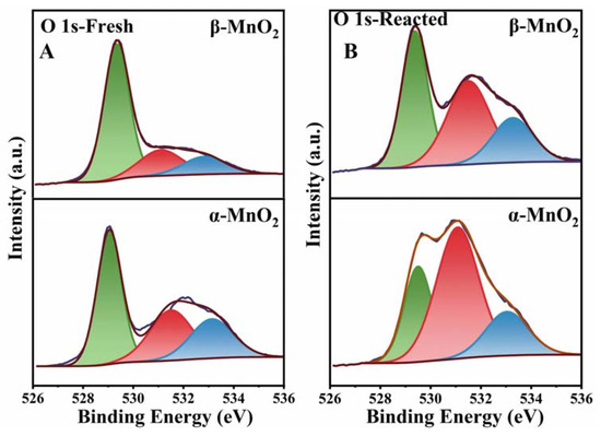 The XPS spectra of O 1s of the samples are shown in Figure 11. Peaks with binding energies at 529–529.8, 530.9–532 and 533 eV in the XPS spectra of O 1s of the MnO2 samples (Figure 11) can be attributed to lattice oxygen (Olatt) and surface adsorption oxygen (Oads), and surface hydroxyl oxygen (OadsO-H), respectively [49,50,51]. The molar ratio of Oads/Olatt is shown in Table 2 and follows the order of α-MnO2 (0.65) > β-MnO2(0.35). Oads was generally considered the most reactive oxygen species in the catalytic reaction and capable of participating in the catalytic oxidation of VOCs in previous reports [52,53]. The oxygen species changes before and after the reaction are shown in Figure 11B and Table 2. The Olatt and Oads for both two materials decreased and increased, respectively, suggesting the migration of Olatt to form Oads during the reduction of Mn. Obviously, α-MnO2 formed more Oads after the reaction, which corresponds to its greater degree of reduction, also implying that α-MnO2 has a stronger catalytic capacity.