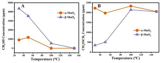The main gas phase products were monitored quantitatively to better understand the reaction process of CH3SH over two different catalysts. As displayed in Figure 12, the decomposition of CH3SH at different temperatures corresponded to the production of CH3SSCH3. Meanwhile, the concentration of CH3SH during the reaction showed an excellent correlation with the concentration of CH3SSCH3, indicating that CH3SSCH3 was the main gas-phase product. At 150 °C, CH3SH was completely decomposed for both MnO2 catalysts, consistent with the thermodynamic theory that catalytic reactions proceed easier at higher temperatures. The yield of CH3SSCH3 gradually decreased when T > 100 °C, which may be due to the further catalytic oxidation of CH3SSCH3 at higher temperatures.