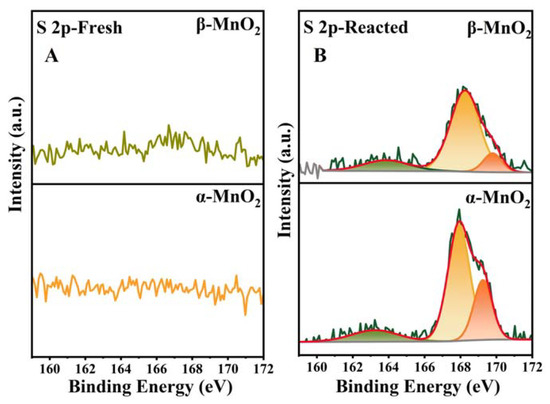 Figure 13 shows the changes of S 2p before and after the reaction, which was used to detect the solid-phase intermediates in the reaction process. No S species were detected on two catalysts before the reaction. In contrast, significant amounts of S species were detected on both samples after the reaction, indicating that some sulfur-containing products were adsorbed on the catalyst surface. As shown in Figure 13B, three peaks at 163.2, 167.9, and 169.2 eV corresponding to S0, SO32− (S4+), and SO42− (S6+), respectively [30,54], which all showed higher valence than S2- from CH3SH, indicating the oxidation of S during the reaction. It is worth noting that the catalytic experiments in CH3SH were performed under a nitrogen atmosphere, so it can be concluded that the O in the S-O species was mainly derived from the Oads of MnO2. This illustrated the Oads involvement in the catalytic reaction of CH3SH. SO32− and SO42− were mainly retained on the manganese dioxide surface in the form of MnSO3 and MnSO4, implying that chemisorption was a prerequisite for the decomposition of CH3SH on MnO2. Notably, reacted α-MnO2 showed a higher proportion of SO42− (S6+) (26.31%) than β-MnO2 (12.56%) (Table 3 and Figure 13B), suggesting a greater degree of S oxidation, which corresponds to a greater reduction of Mn4+ after the reaction (Table 1 and Figure 9B). Furthermore, SO42− requires more oxygen to be coordinated with S than SO32−, so a higher proportion of SO42− production requires more Oads to participate in the reaction. Correspondingly, the H2-TPR, O2-TPD, and XPS analysis demonstrated more Oads and better surface oxygen mobility for α-MnO2 than β-MnO2.