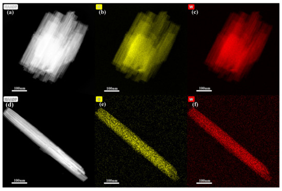 Elemental mapping images of the formed products with different initial reactants. (a–c) 1.4432 g Na2WO4 2H2O, 30 mL 0.25 mol L−1 H2SO4, (d–f) 1.4432 g Na2WO4 2H2O, 20 mL 0.375 mol L−1 H2SO4, and 10 mL glycerol.